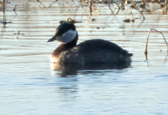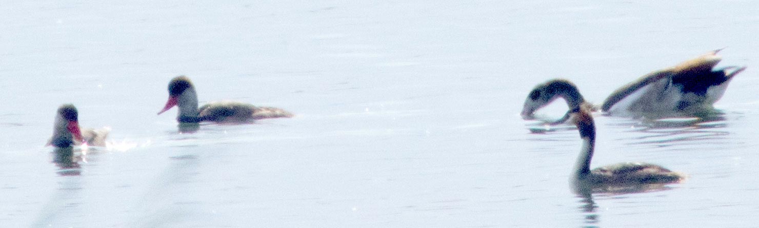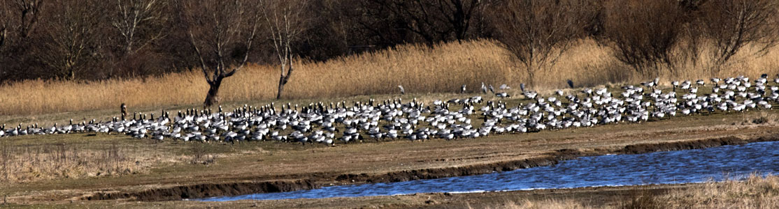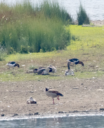 Foto vom Beobachtungsturm Schurrsee aus. 16:00. Die beiden Rothalsgänse waren in Gesellschaft von Graugänsen und Nilgänsen.
