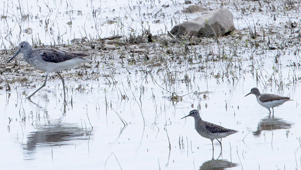 Grünschenkel mit Bruchwasserläufer und Flussuferläufer